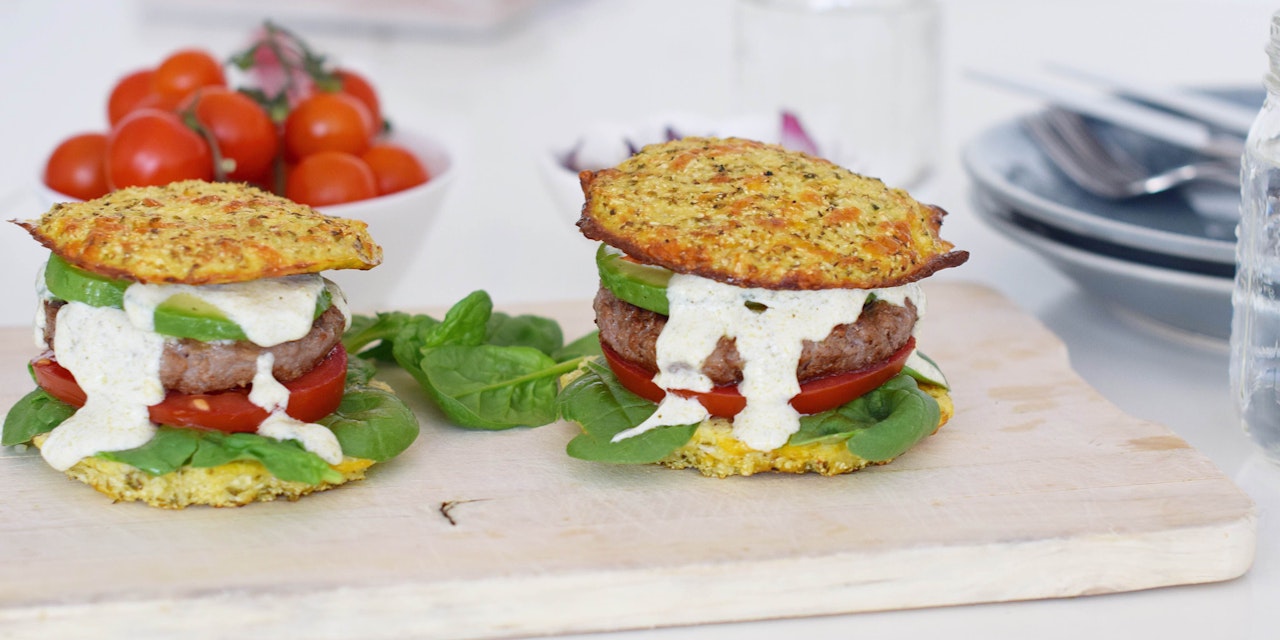 Preheat the oven to 160 C / 320 F. Trim the cauliflower from core and cut into pieces. Add cauliflower to a food processor and pulse until the cauliflower is finely chopped and “rice”-shaped. Add the cheese, egg, oregano, salt and pepper and pulse a few more times. Line a baking sheet with baking paper and grease with olive oil. Form 0,4 inch / 1 cm thick patties of the cauliflower mixture and place on the sheet. Bake for 40 min until golden and firm like a bread. Let cool and remove by using a spatula. For the sauce whisk together quark with pesto. Cook your burgers, place them on a cauliflower buns and top your burgers with vegetables and pesto sauce for the best low-carb burger you’ll ever have.