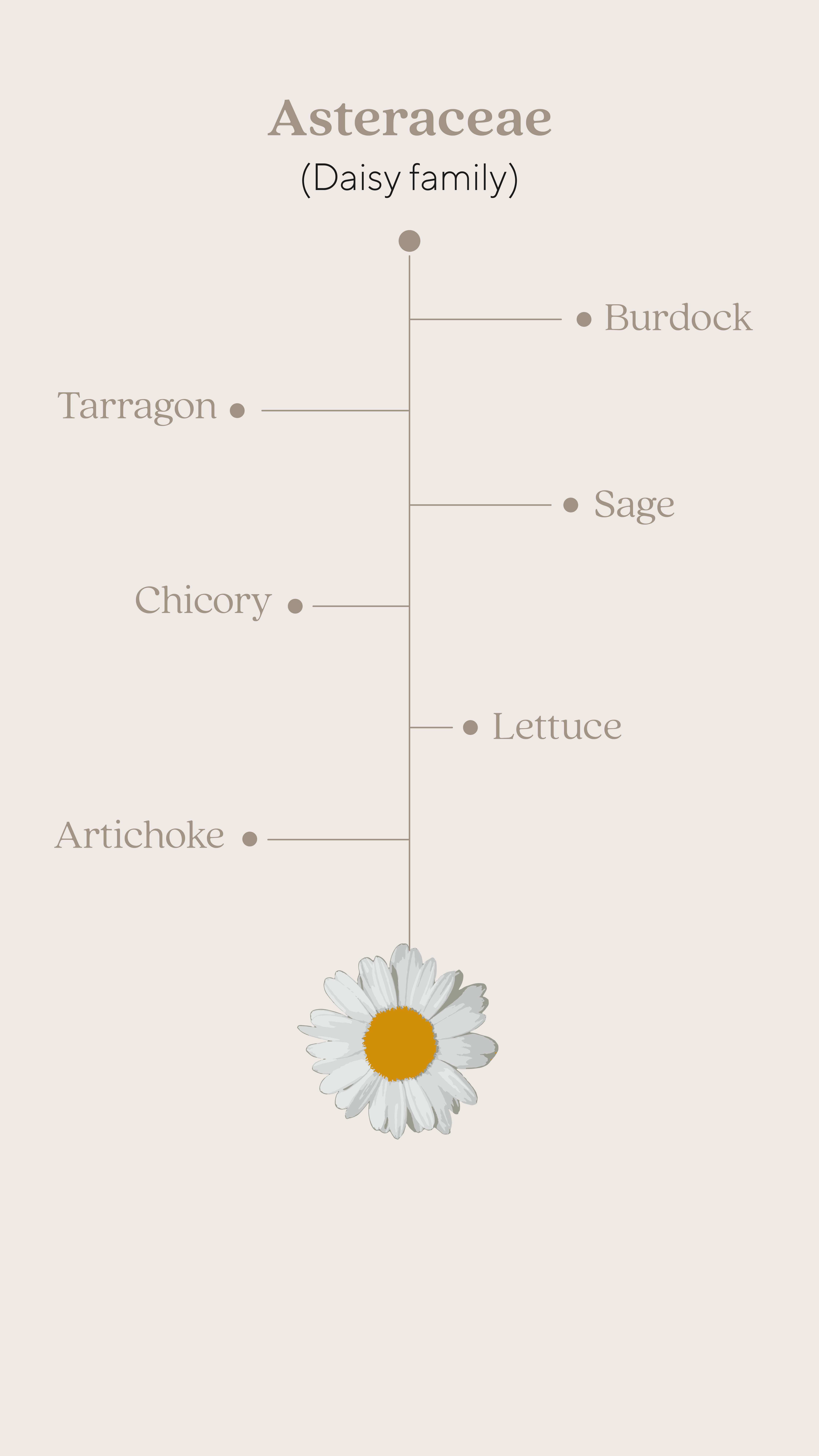 This family is characterized by its well known beautiful daisy flowers. Vegetables in this family also include artichoke, lettuce, chicory, sage, burdock and tarragon.