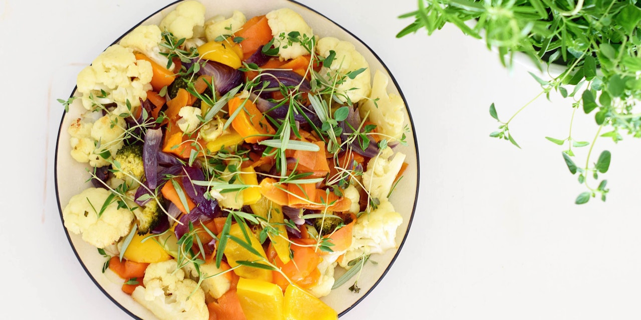 Preheat the oven to 175 C / 350 F / GM 4. Use a mandoline or slicer to slice the carrots lengthwise. Put in a bowl together with the rest of the vegetables. Drizzle with olive oil and add fresh rosemary and thyme. Cover a baking sheet with baking paper. Spread out the vegetables and bake in the oven for 25-30 min until golden and tenderly roasted.